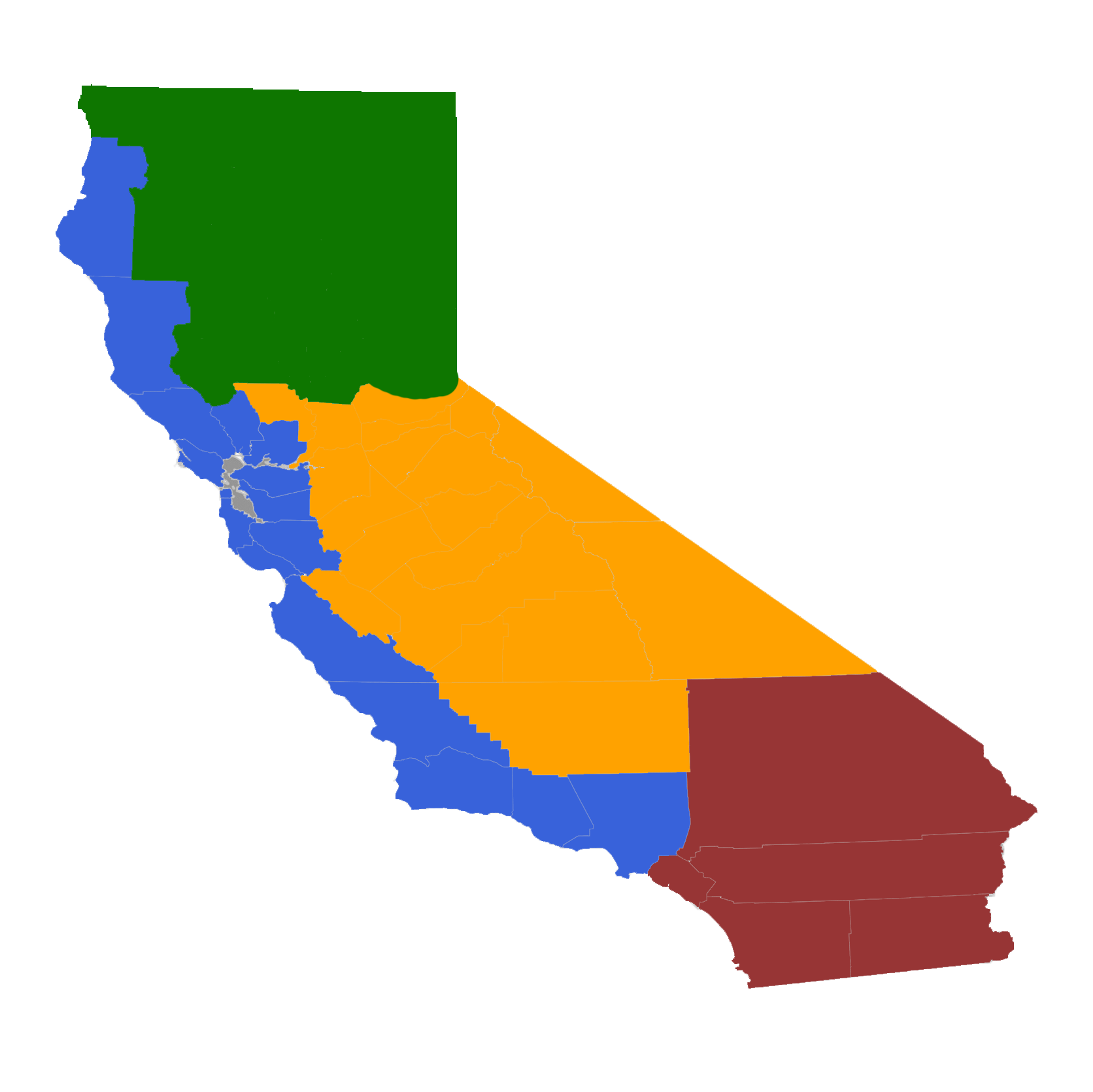 Coastal California: Humboldt, Mendocino, Sonoma, Napa, Marin, Solano, Contra Costa, Alameda, San Francisco, San Mateo, Santa Clara, Santa Cruz, San Benito, Monterey, San Luis Obispo, Santa Barbara, Ventura, Los Angeles